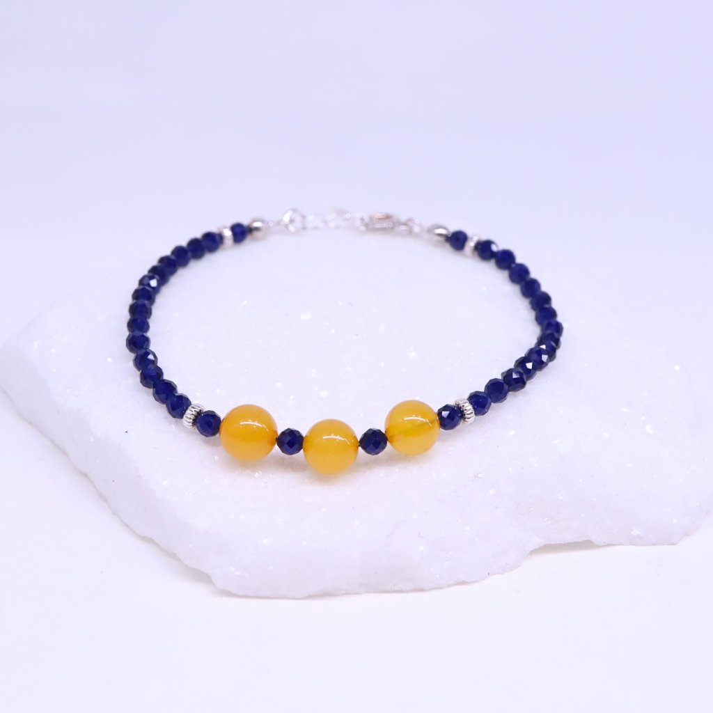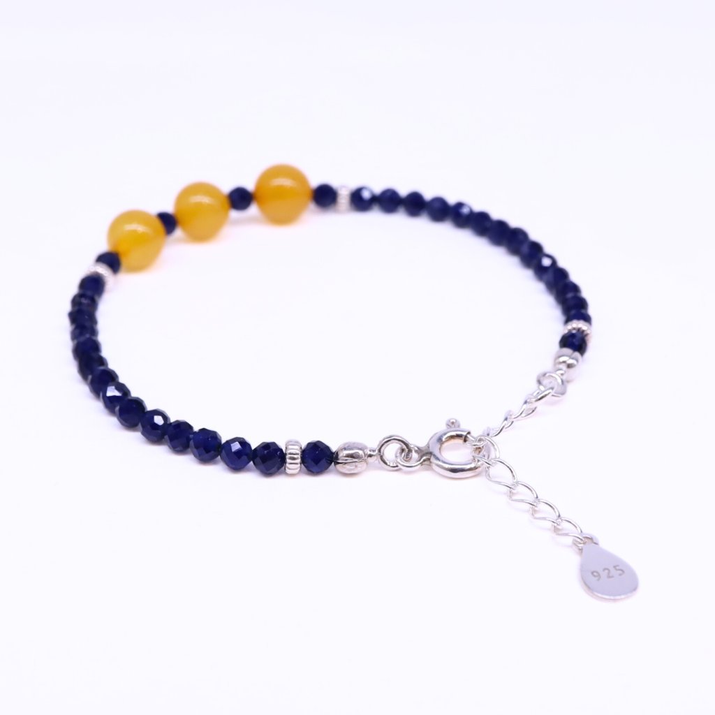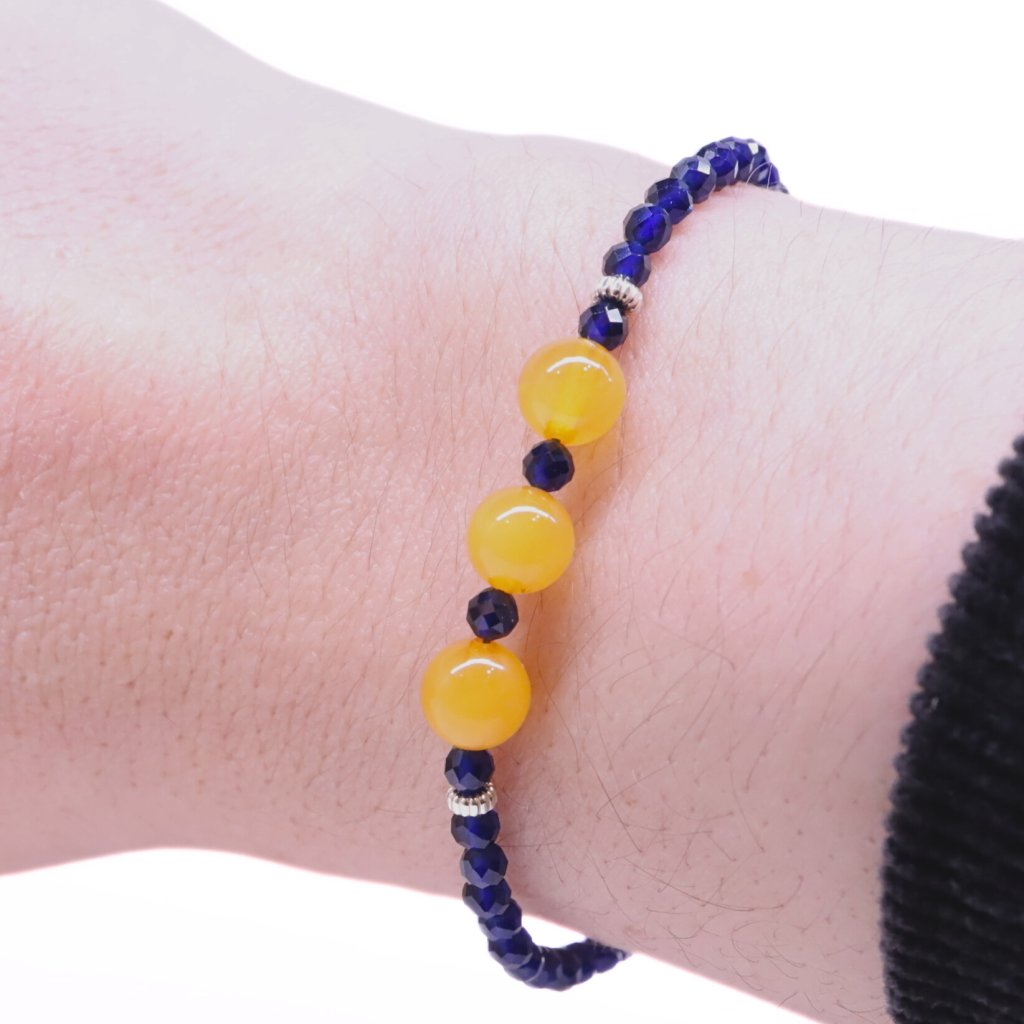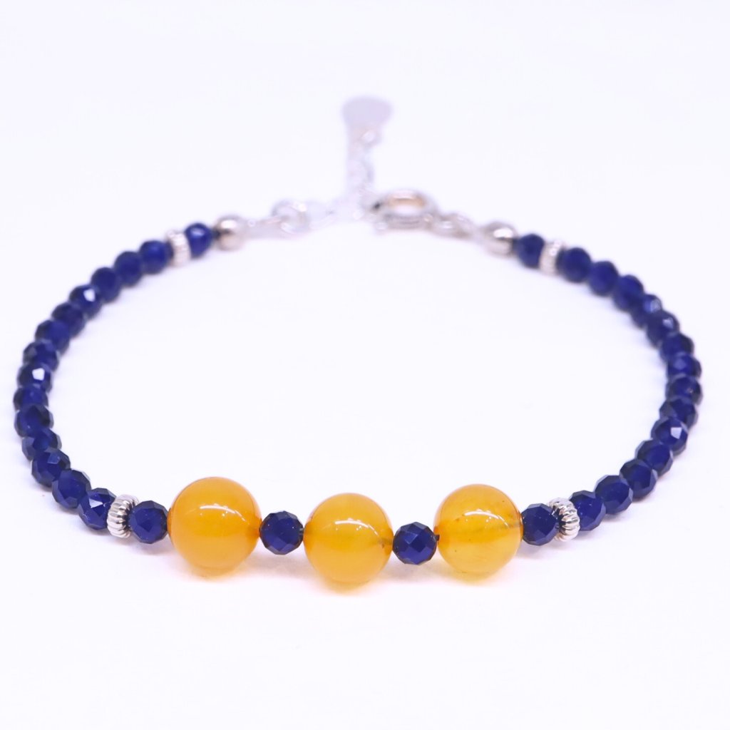 With this delicate bracelet made of sapphire, gold-plated silver, and natural Baltic amber, you will feel well-groomed and elegant.