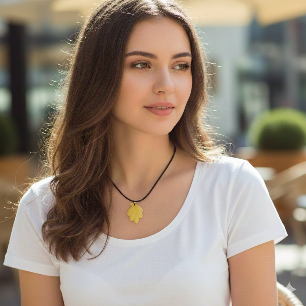 A delicate pendant made of genuine Baltic amber in the shape of a leaf. The leaf is a symbol of renewal and growth. It is also associated with the cycles of life. It evokes the energy of trees and the sun. The twisted satin cord highlights the amber pendant without taking attention away — together they create a truly luxurious feel.