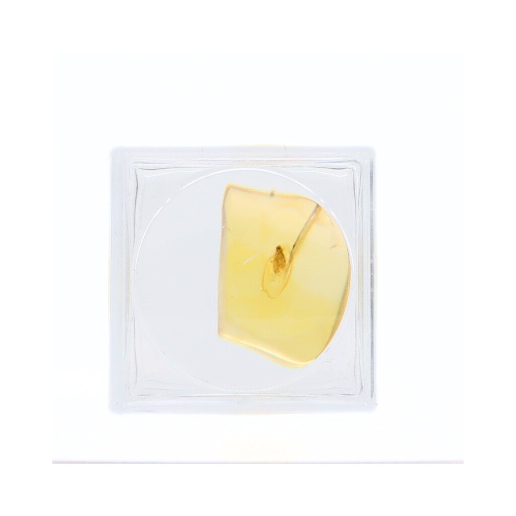 The amber piece comes in a clear plastic box with a built-in magnifying lid for easier viewing. It's fixed to the bottom with transparent adhesive so it stays stable and well-visible from all angles.