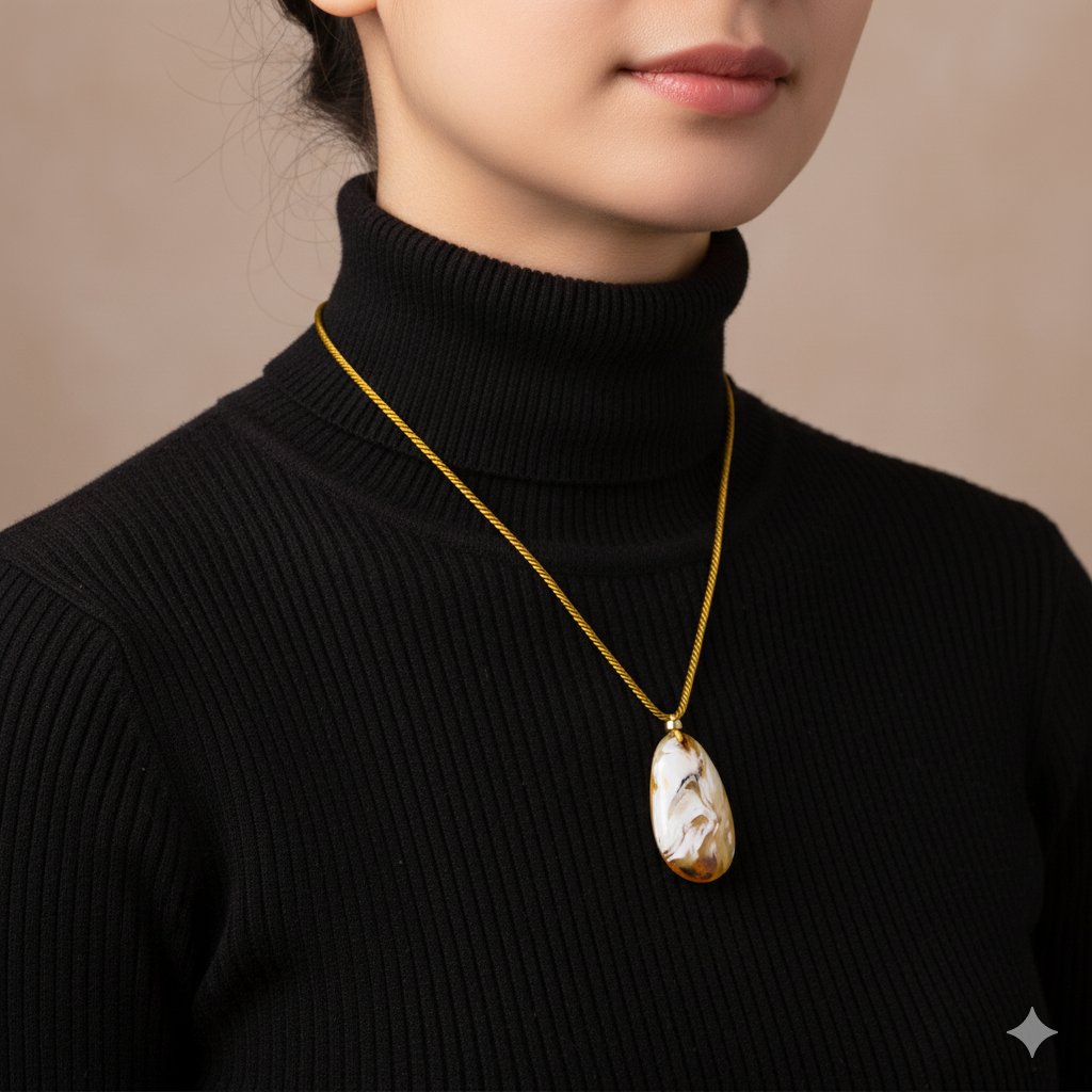 A striking pendant made of genuine Baltic amber, combining yellow and white colours. It resembles an abstract painting. The clasp is made of gold-plated Ag 925/1000. Suitable for any artistic and aesthetically minded soul.