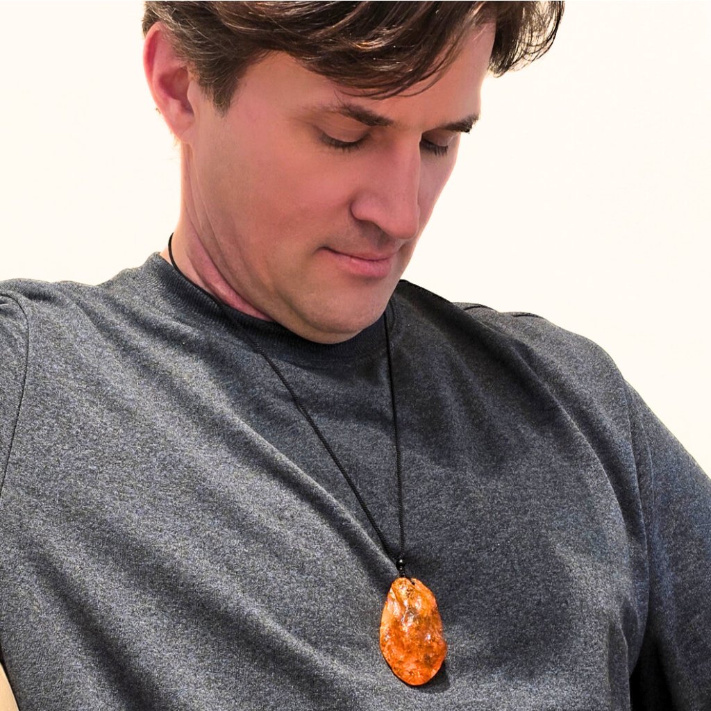 An unusual pendant made of natural Baltic amber on a decorative cord. It will further emphasize a personality that radiates extraordinary energy and charisma. Suitable for both men and women. The amber has been partially sanded and has a polished crust. The beauty of nature that you must treat yourself to.
