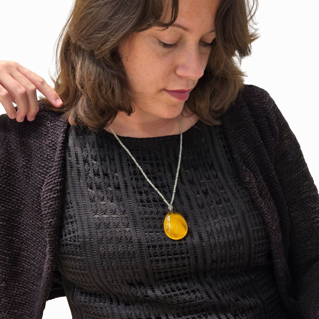 Představte si ten pocit, když nosíte u srdce magický kámen, který v sobě skrývá sílu slunce a nebes. Takový je právě tento přívěsek z baltského jantaru v top kvalitě na náhrdelníku z korálků z prehnitu. Posuvné vázání vám umožní přizpůsobit si délku podle potřeby.