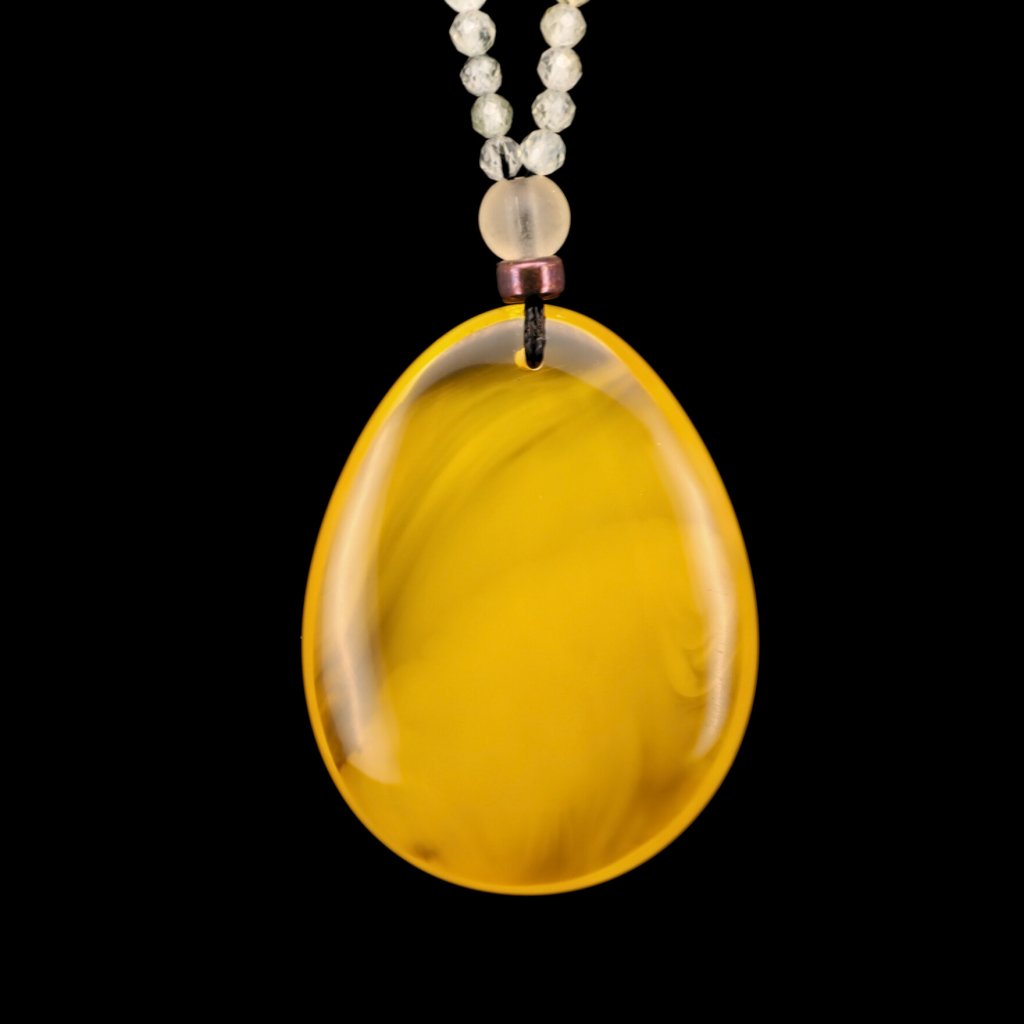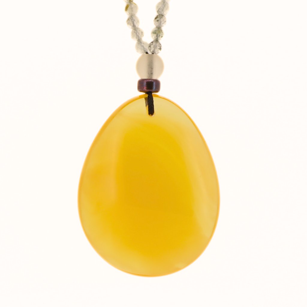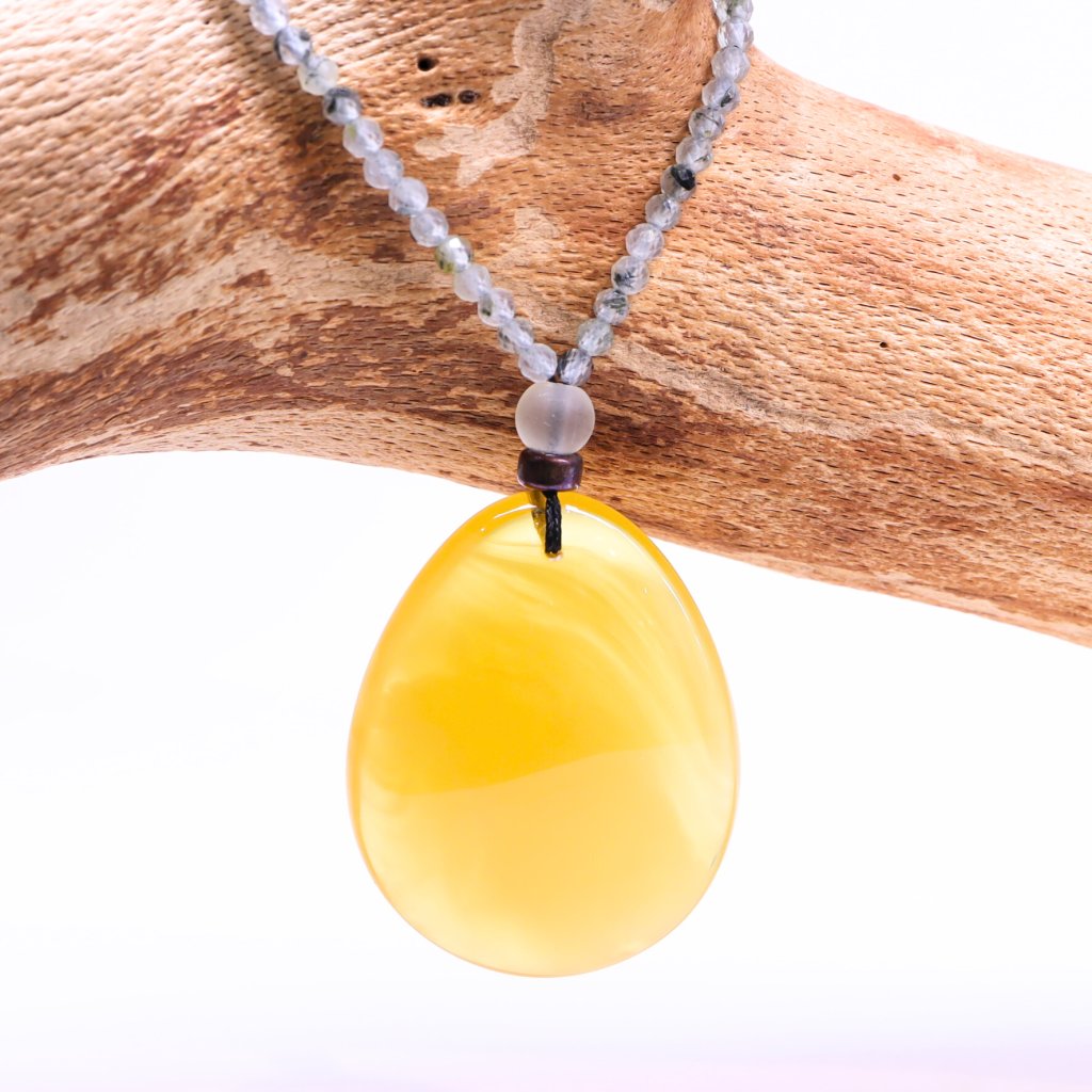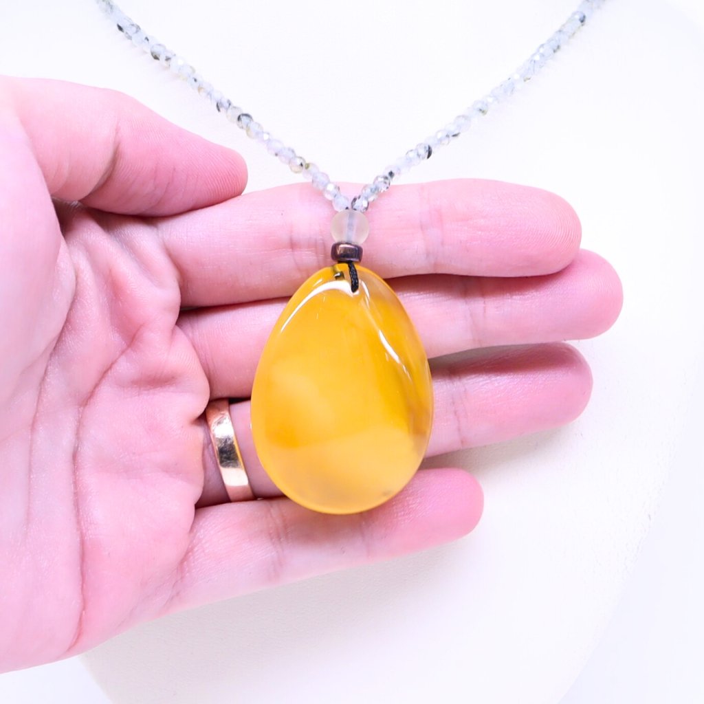 Představte si ten pocit, když nosíte u srdce magický kámen, který v sobě skrývá sílu slunce a nebes. Takový je právě tento přívěsek z baltského jantaru v top kvalitě na náhrdelníku z korálků z prehnitu. Posuvné vázání vám umožní přizpůsobit si délku podle potřeby.