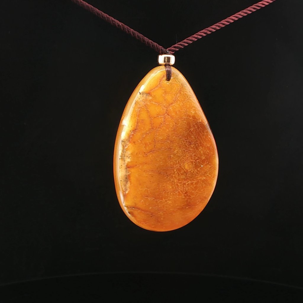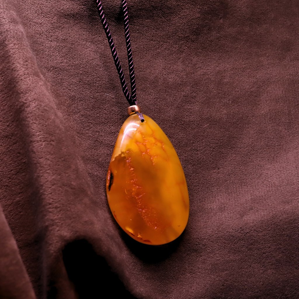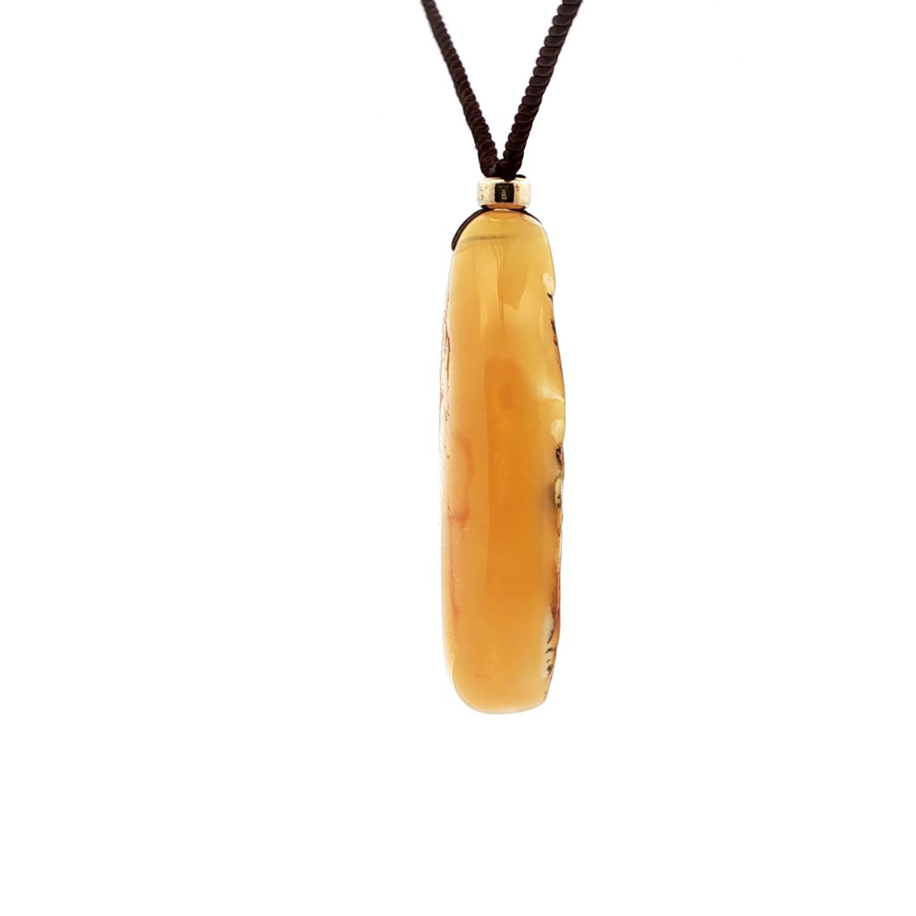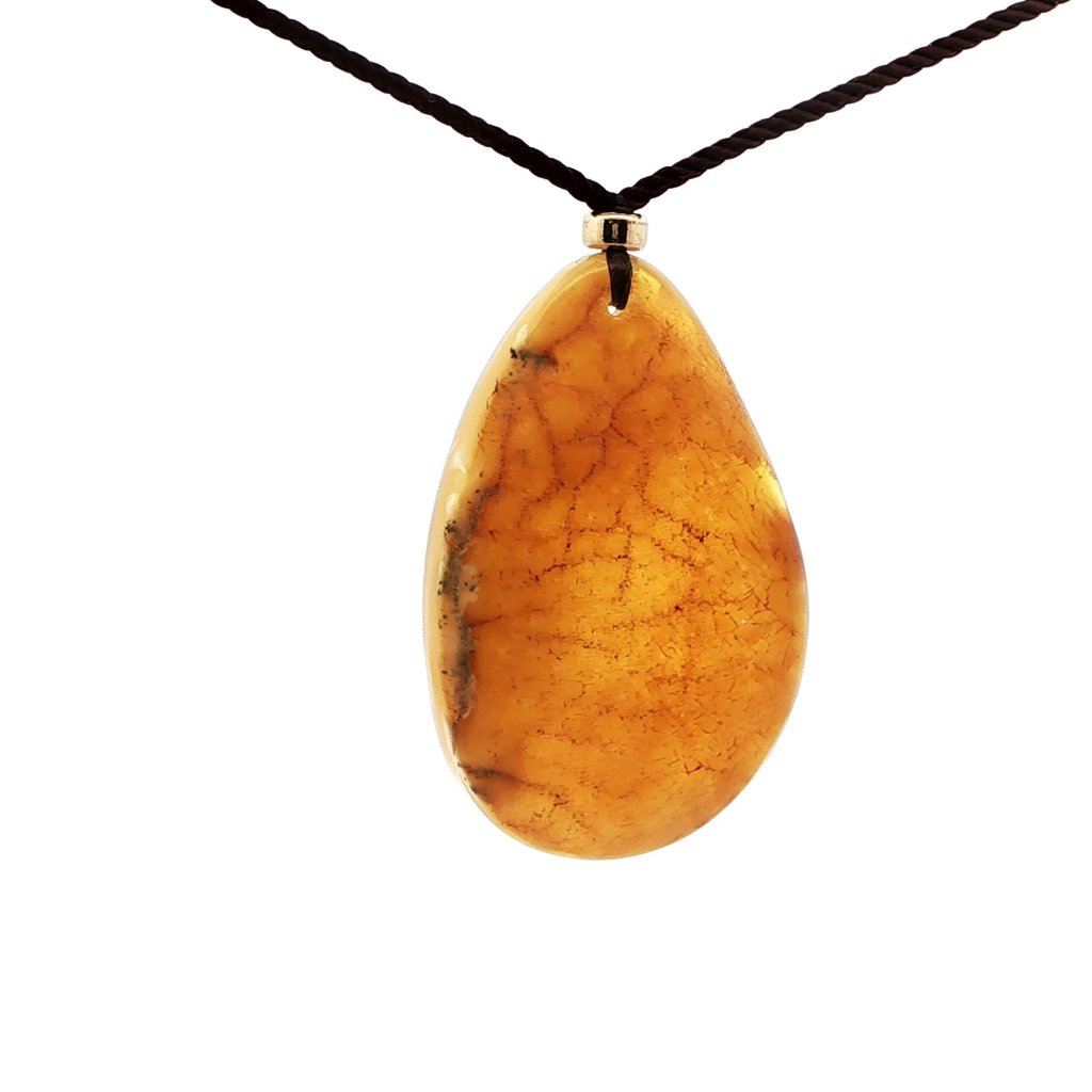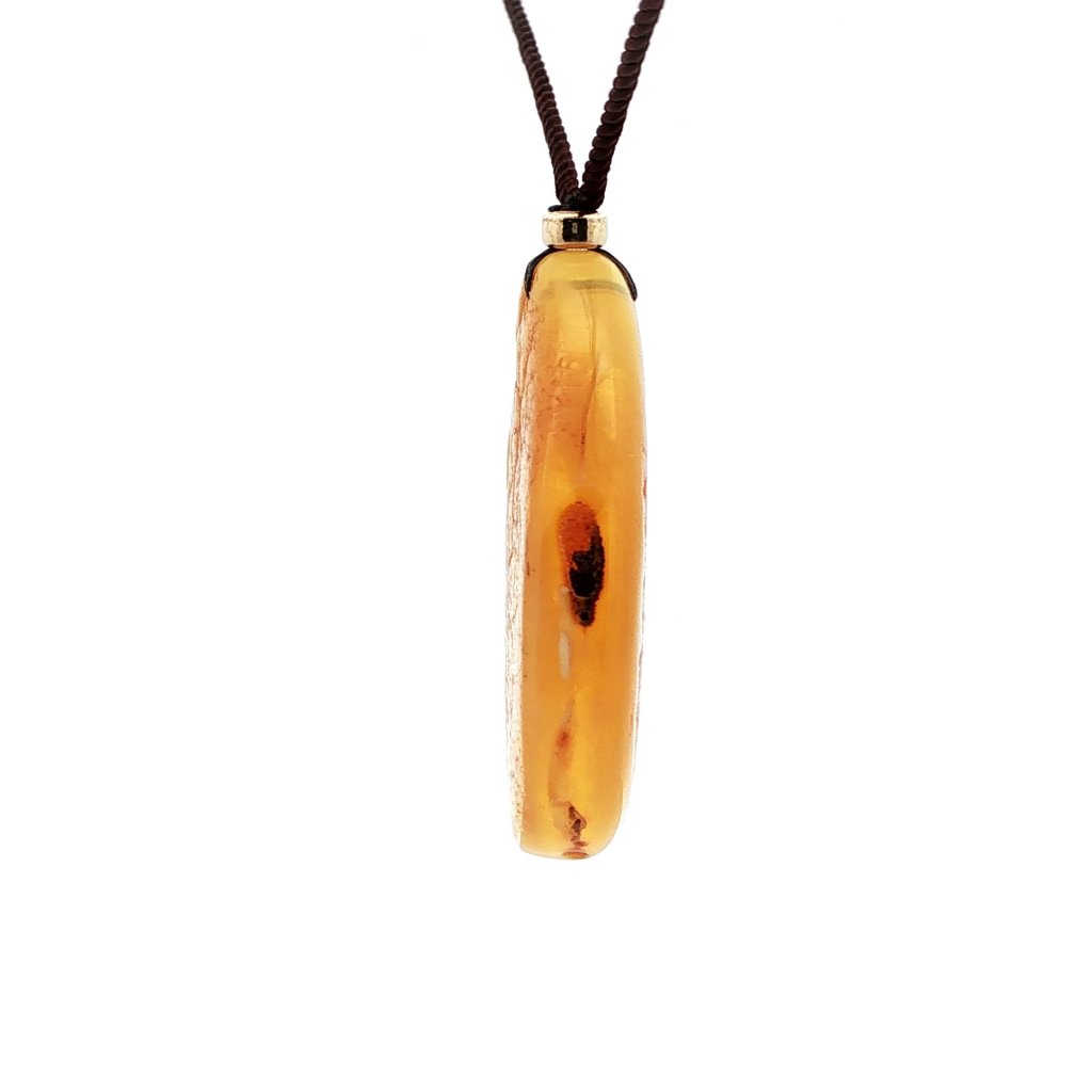 Přívěsek na zdobné šňůrce je z pravého baltského jantaru. O jantaru se říká, že když je v kontaktu s pokožkou, vyživuje svého majitele a naopak. Je to šperk, který je s Vámi v dobrém i zlém jako věrný přítel. Zlehka obroušená a vyleštěná přírodní kůra jantaru dává přívěsku typickou barvu dobře vyzrálé whisky.