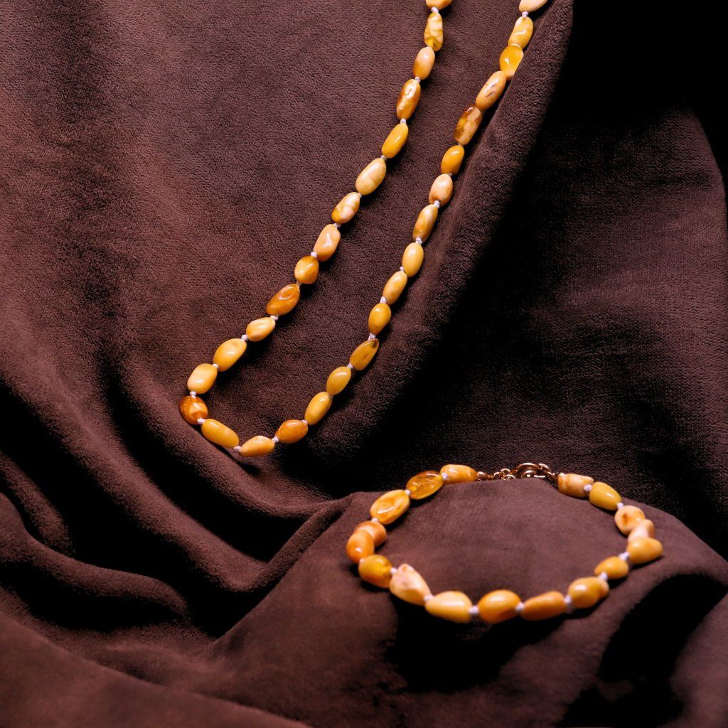 Jantar je lehký a nestudí jako některé minerály. Časem se jeho barva stane sytější a kresba korálků výraznější. Je to proto, že se jedná o drahokam organického původu, podobně jako například korál.