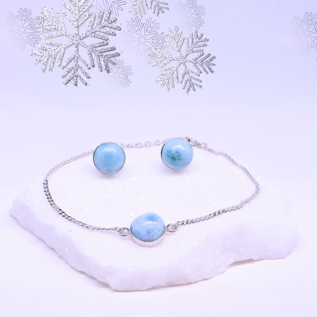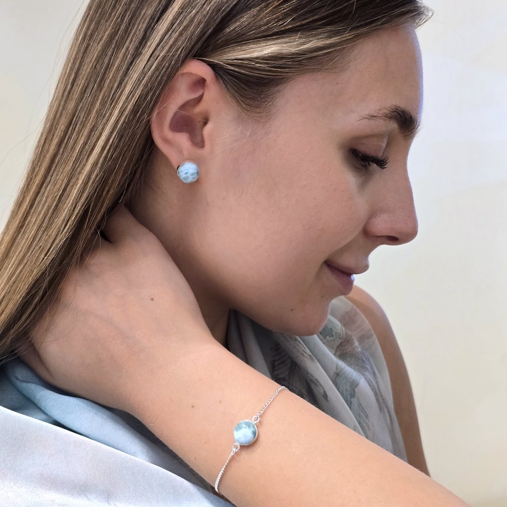 Minimalistické stříbrné náušnice a náramek s larimarem, kamenem klidu a moře, vás každý den přenesou na místo, kde se zastavil čas a vládne léto po celý rok. Náušnice mají puzetové zapínání.