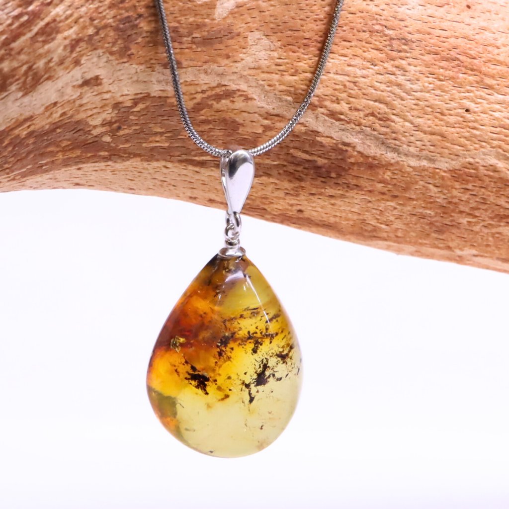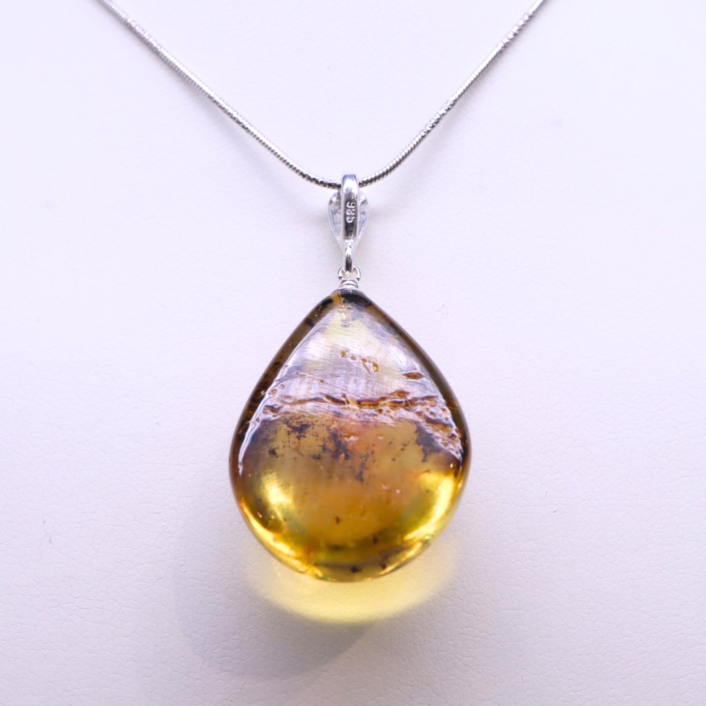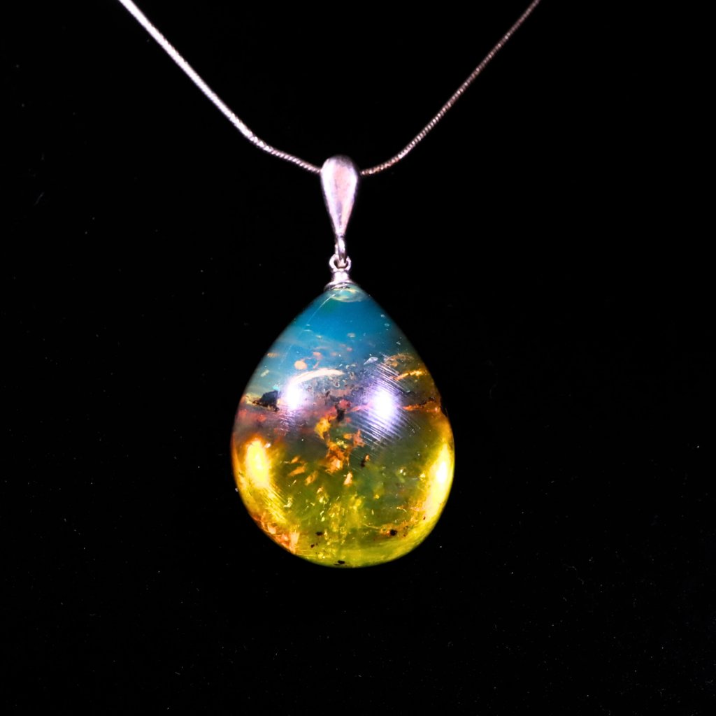 Jantar v tomto přívěsku má na černém podkladu a na sluníčku světlou modro-zelenožlutou barvu. Je zajímavou souhrou přírody, má v nitru inkluze.