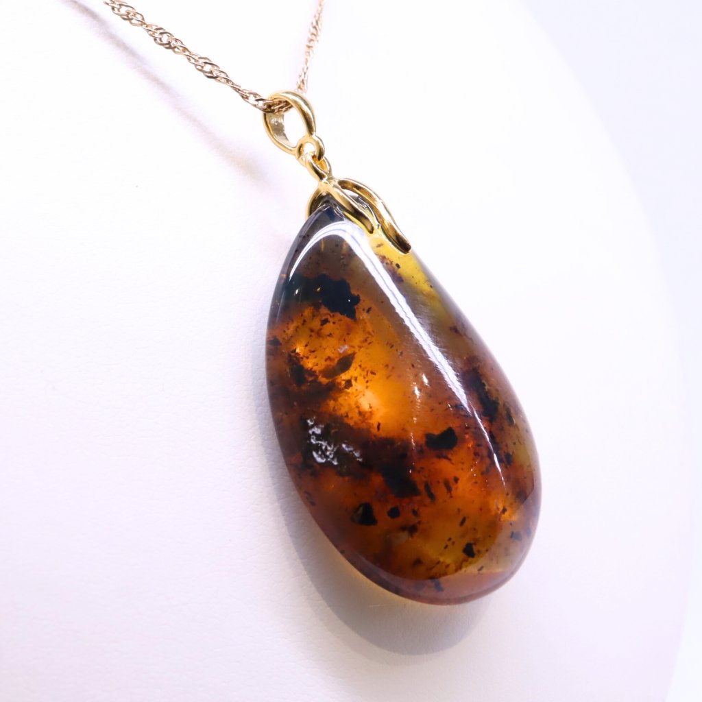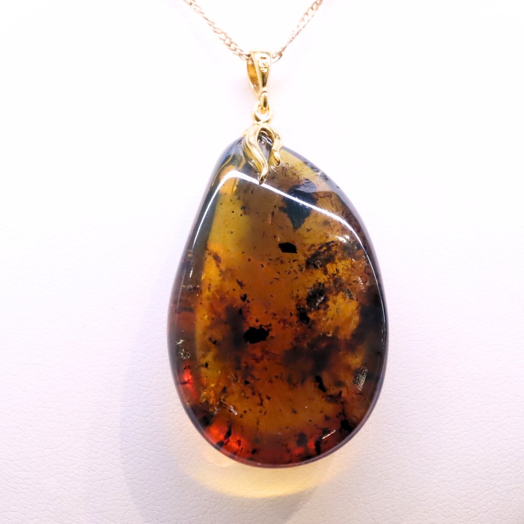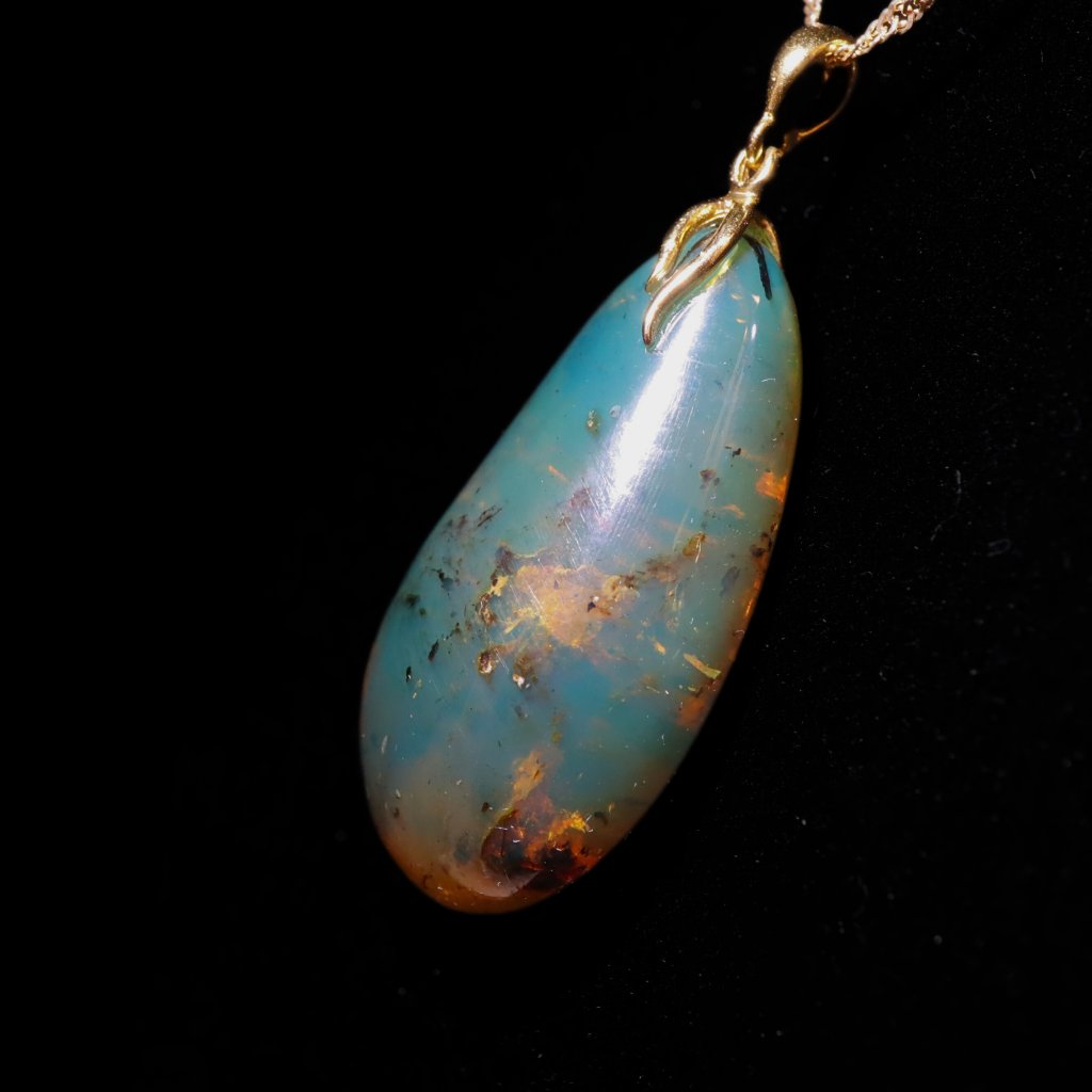 Přívěsek je vybroušený z přírodního modrého dominikánského jantaru. Obsahuje inkluze. Na černém podkladu a na sluníčku modrou barvu, na bílém pozadí zase hnědou, až mírně do žluta. Aby jeho hra se světlem vynikla, doporučujeme nosit ho na tmavém oblečení.