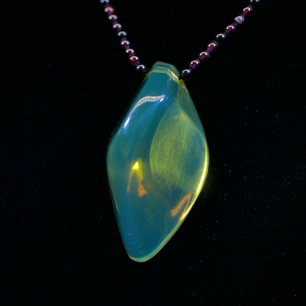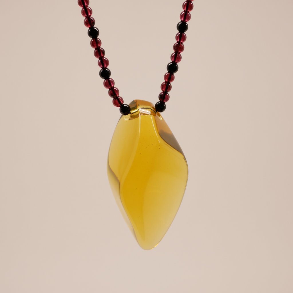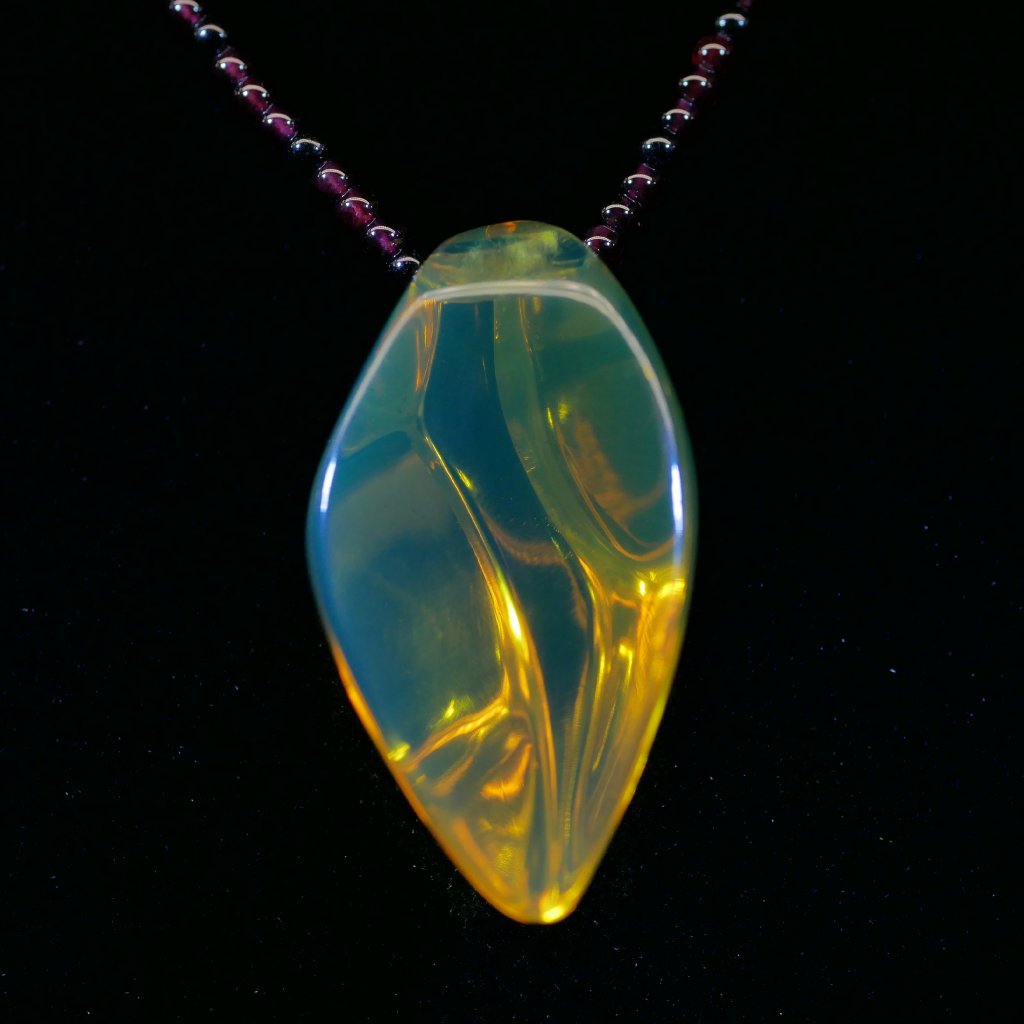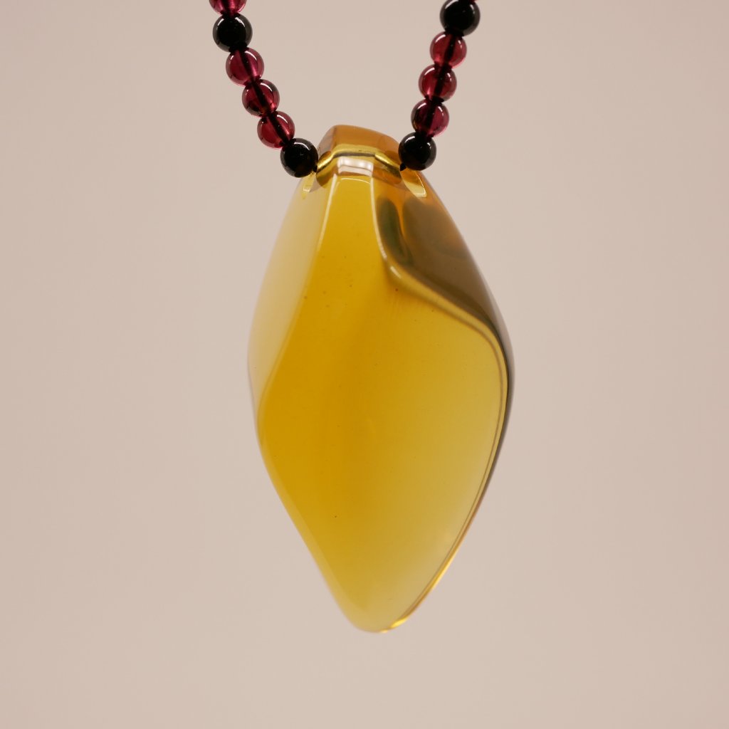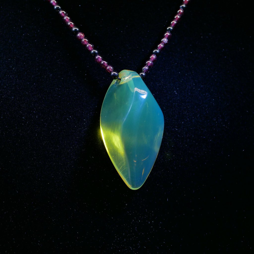 Přívěsek je vybroušený ze vzácného dominikánského modrého jantaru AAA kvality na náhrdelníku z granátu.
