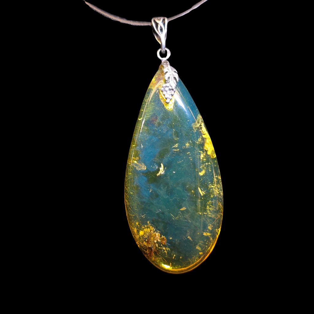 Přívěsek je vybroušený a z modrého přírodního dominikánského jantaru. Obsahuje inkluze.