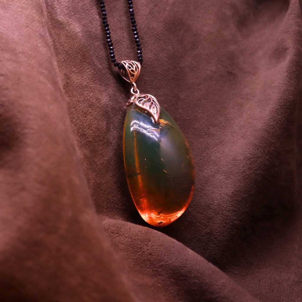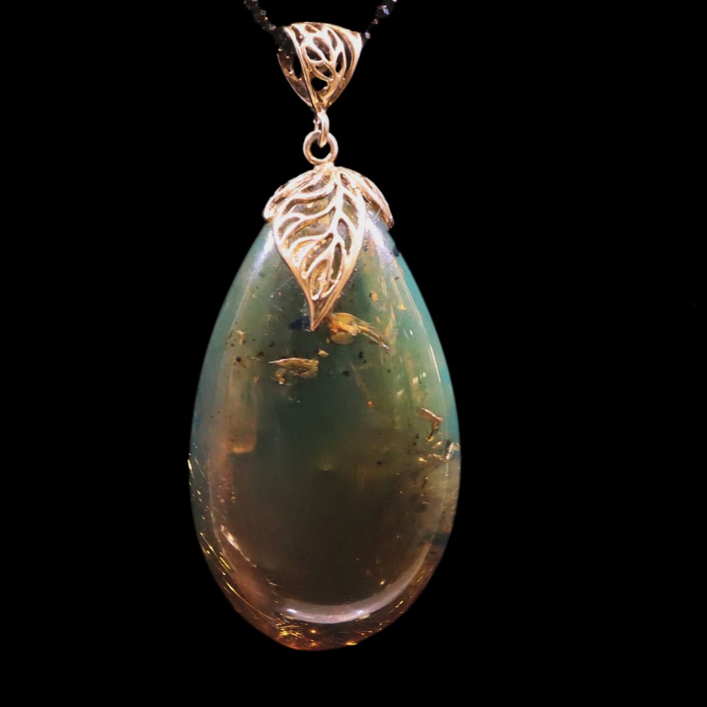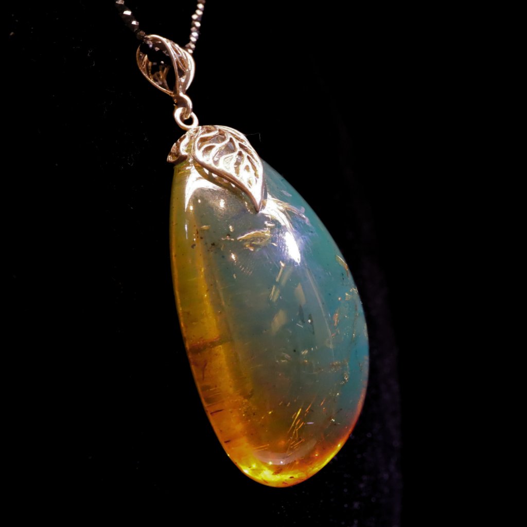 Přívěsek je vybroušený z modrého přírodního dominikánského jantaru. Obsahuje drobné inkluze, které samé o sobě vytváří uvnitř jantaru obraz připomínající abstraktní tušovou malbu. Na černém podkladu a na sluníčku má nebesky modrou a tmavě zelenou barvu, na bílém pozadí zase okrově žlutou. Aby jeho hra se světlem vynikla, doporučujeme nosit ho na tmavém oblečení.