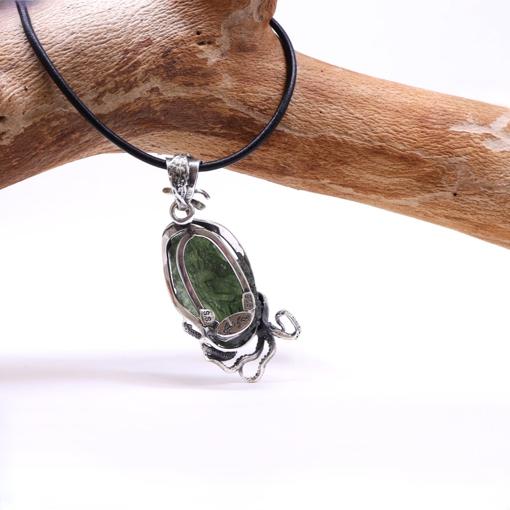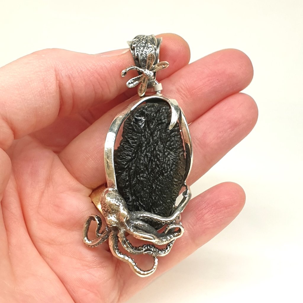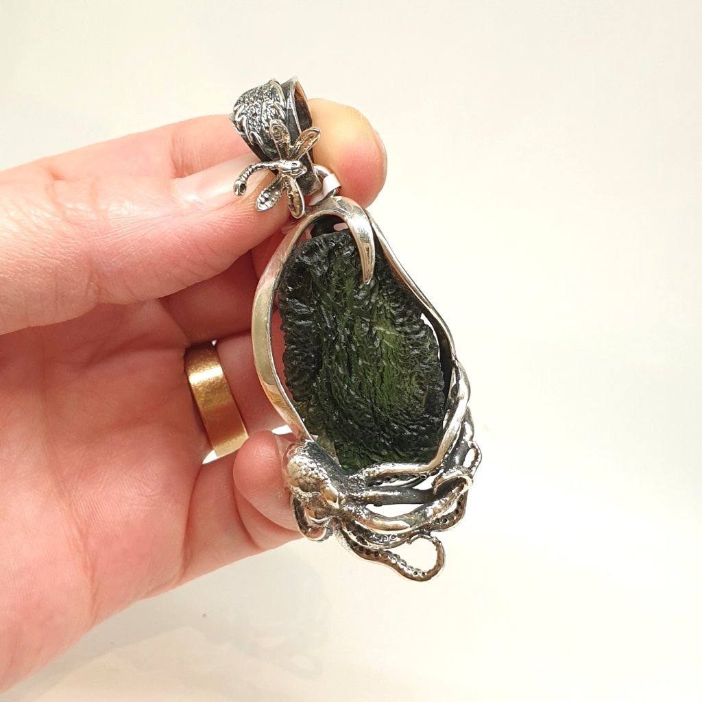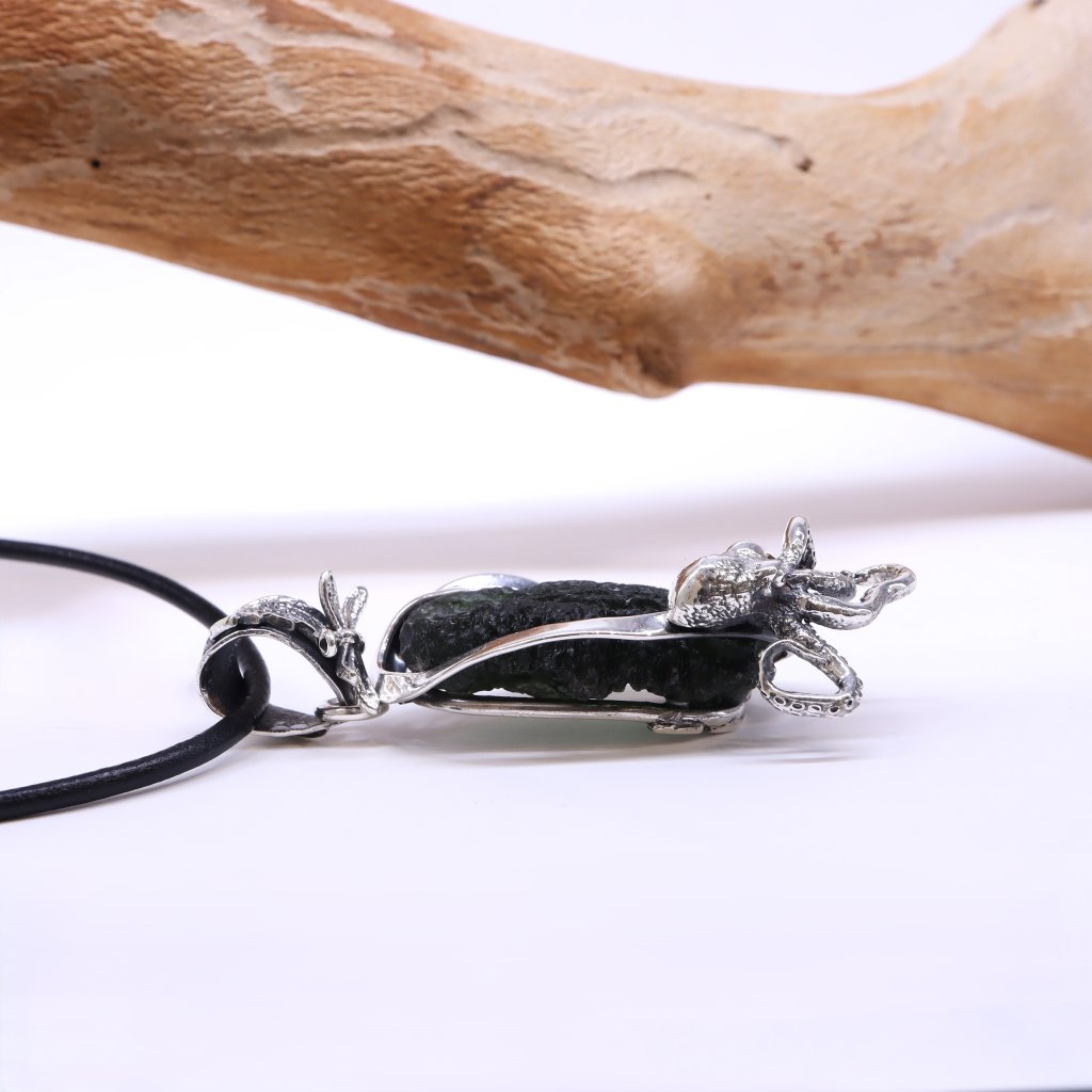 Autorský vltavínový přívěsek „Chobotnice s vážkou“ kombinuje symboliku dvou fascinujících tvorů. Chobotnice představuje inteligenci, přizpůsobivost a schopnost řešit složité situace, zatímco vážka symbolizuje lehkost, transformaci a hledání pravdy pod povrchem. Společně tyto motivy odrážejí psychologickou sílu člověka – schopnost vyrovnat se s výzvami života a přitom neztrácet nadhled a vnitřní rovnováhu.