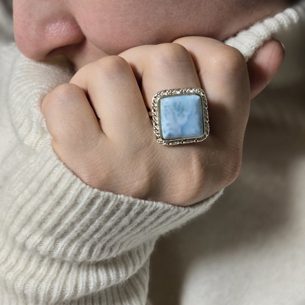 Stříbrný prsten s larimárem, kamenem klidu a moře, vás každý den přenesou na místo, kde se zastavil čas a vládne léto po celý rok. Na Vaší ruce se bude krásně vyjímat jako solitér.
