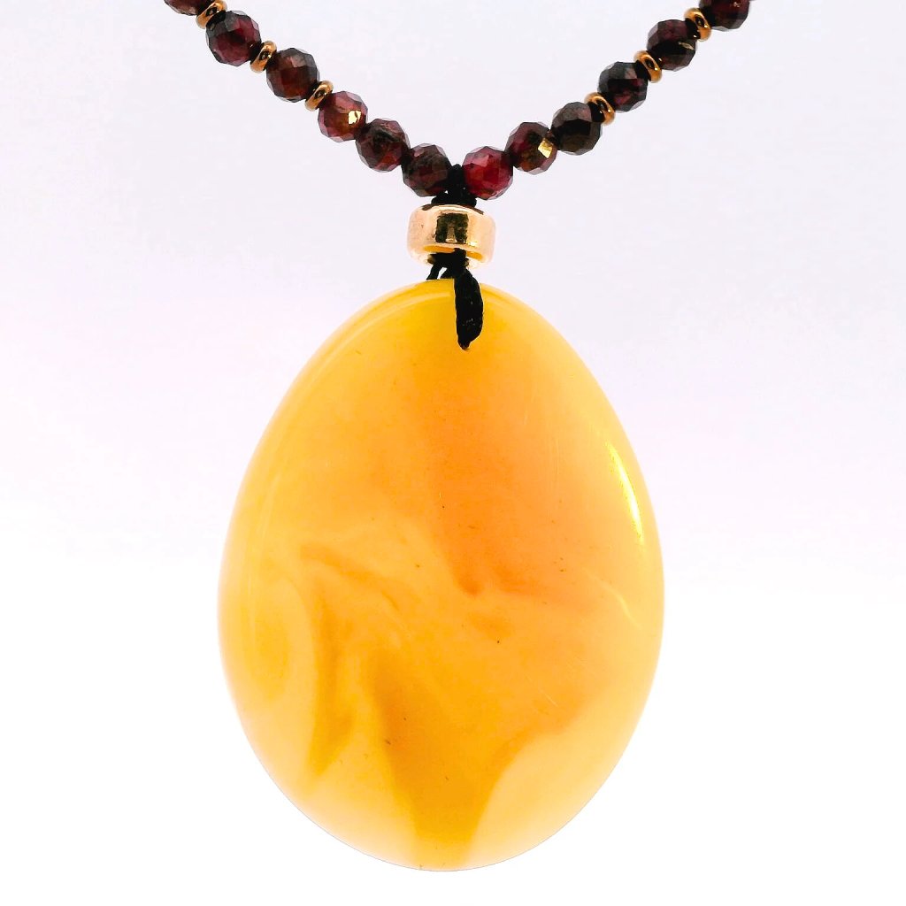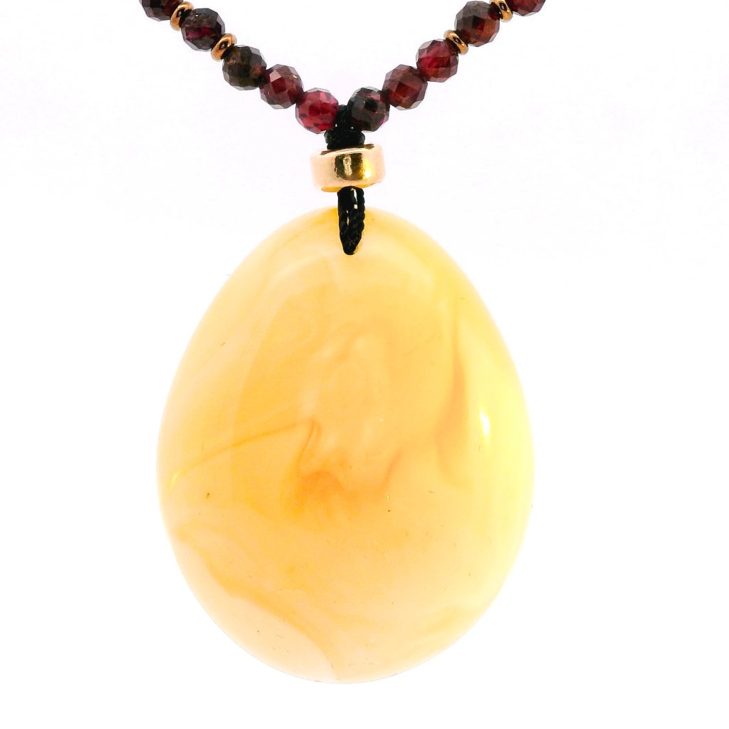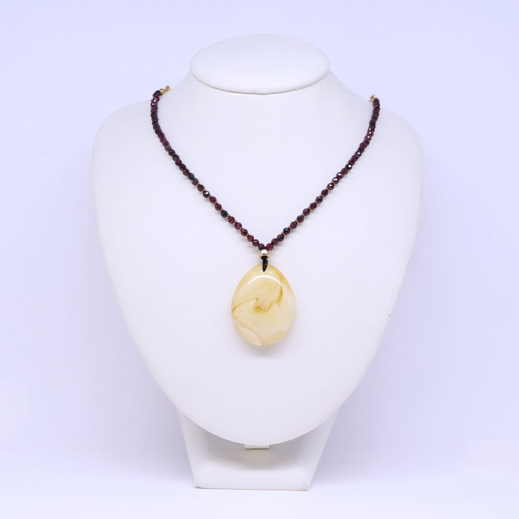 Přívěsek z baltského jantaru s unikátní kresbou a mléčnou barvou. Náhrdelník je tvořen z komponentů z pozlaceného stříbra Ag 925/1000 a granátu.
