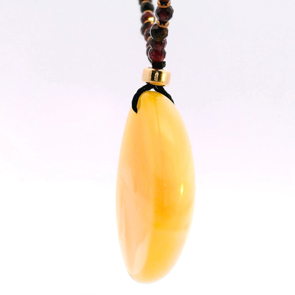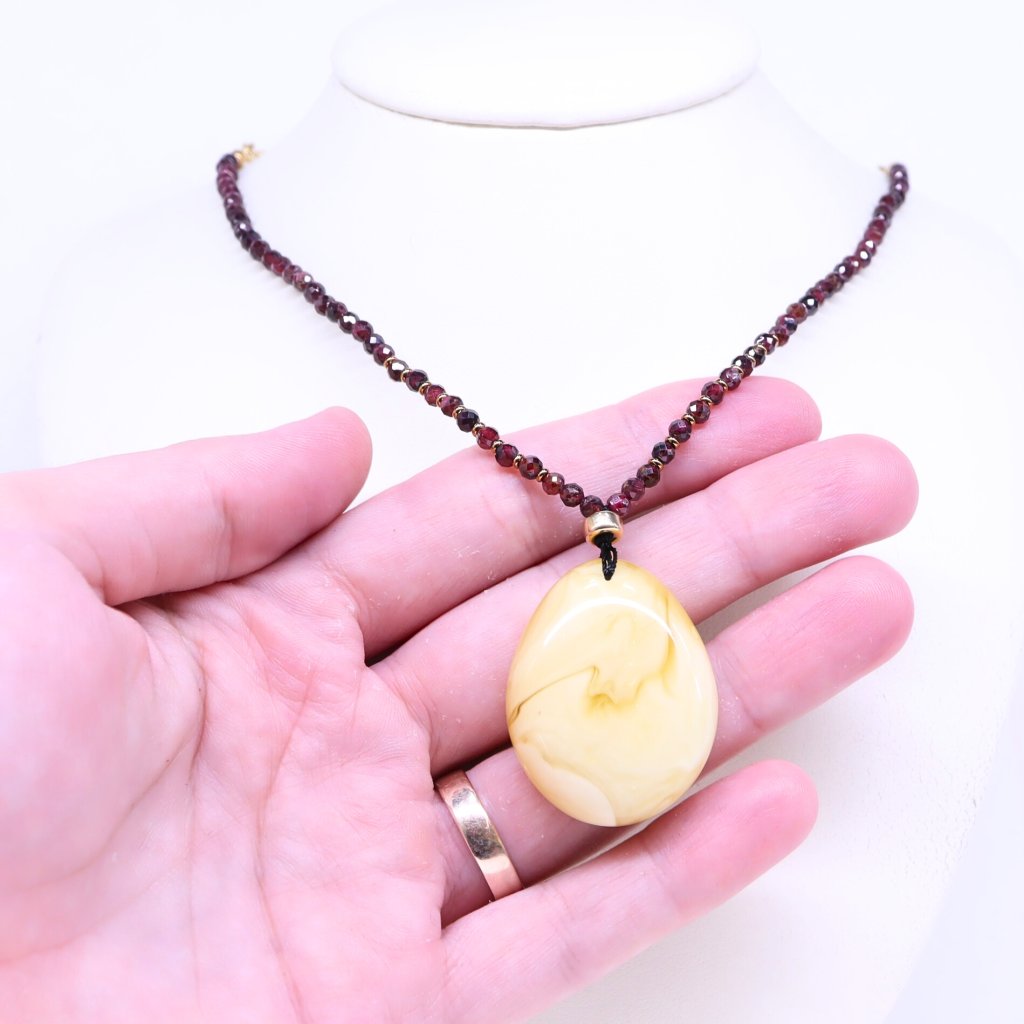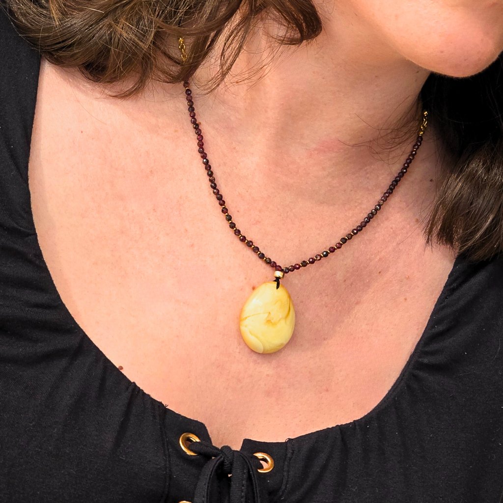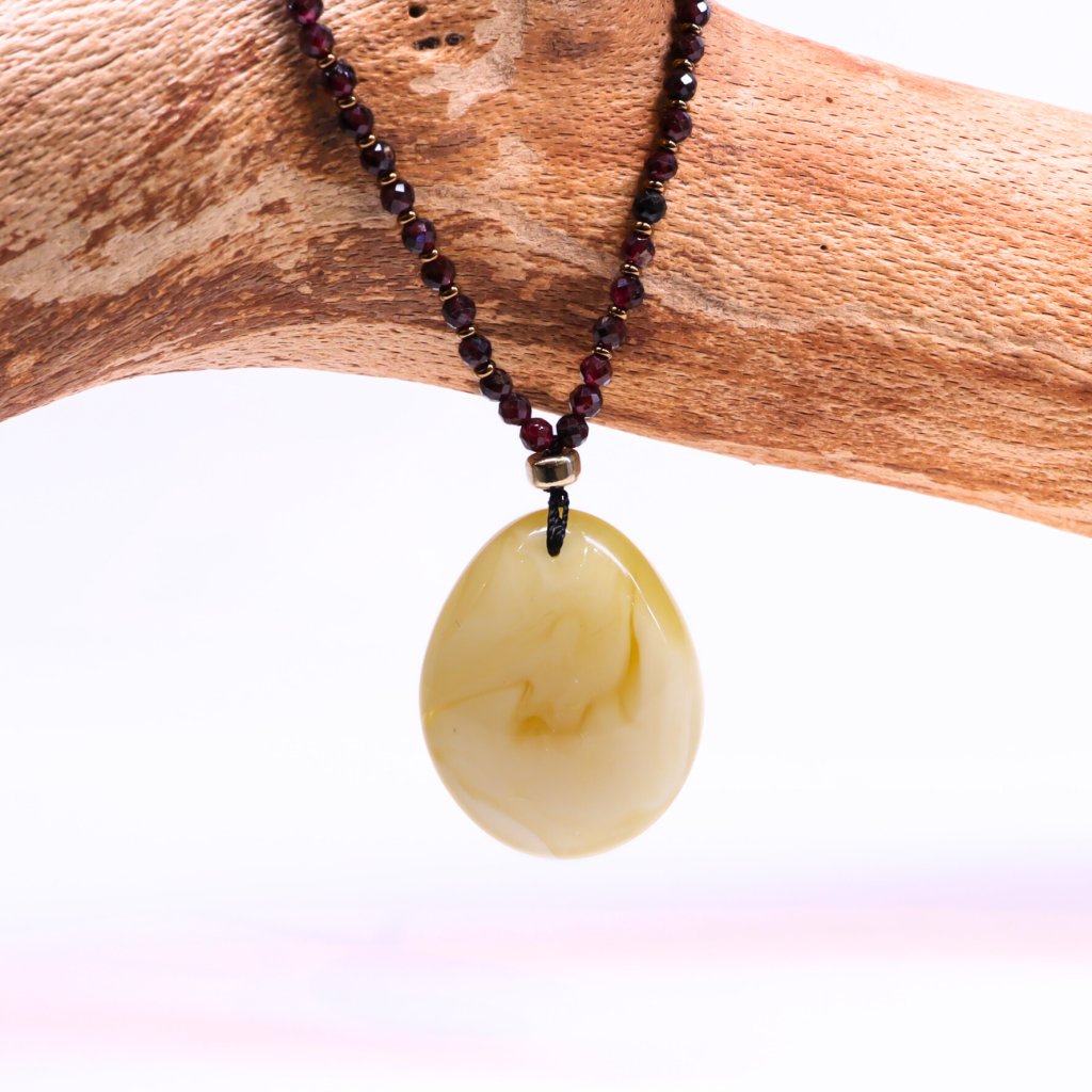 Přívěsek z baltského jantaru s unikátní kresbou a mléčnou barvou. Náhrdelník je tvořen z komponentů z pozlaceného stříbra Ag 925/1000 a granátu.