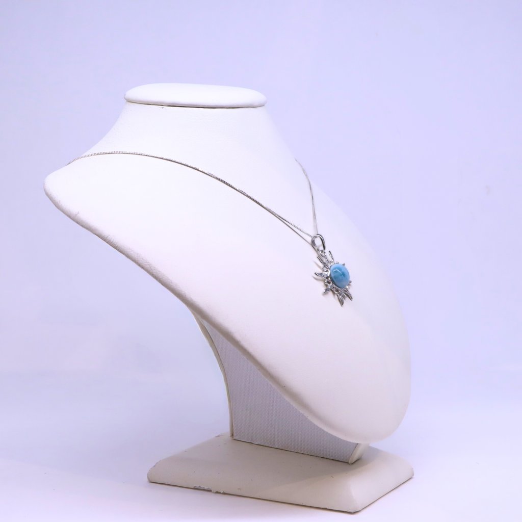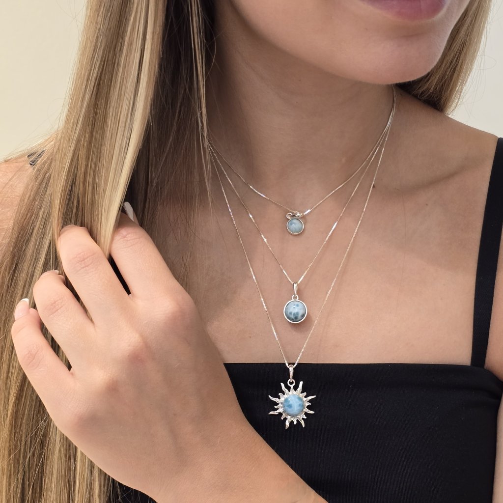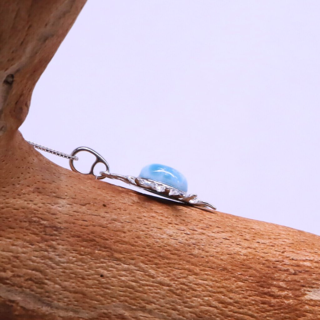 Jemný stříbrný přívěsek s larimárem, kamenem klidu a moře, vás každý den přenese na místo, kde se zastavil čas a vládne léto po celý rok.