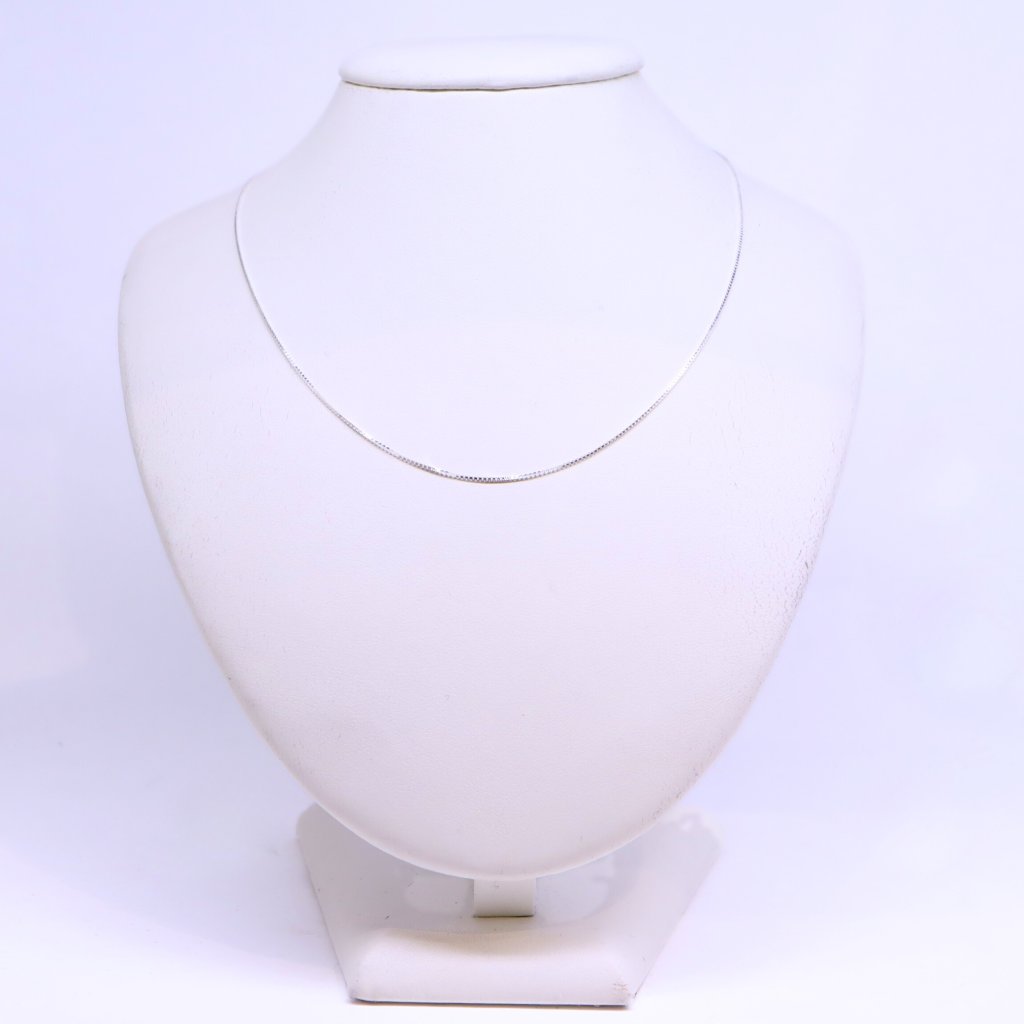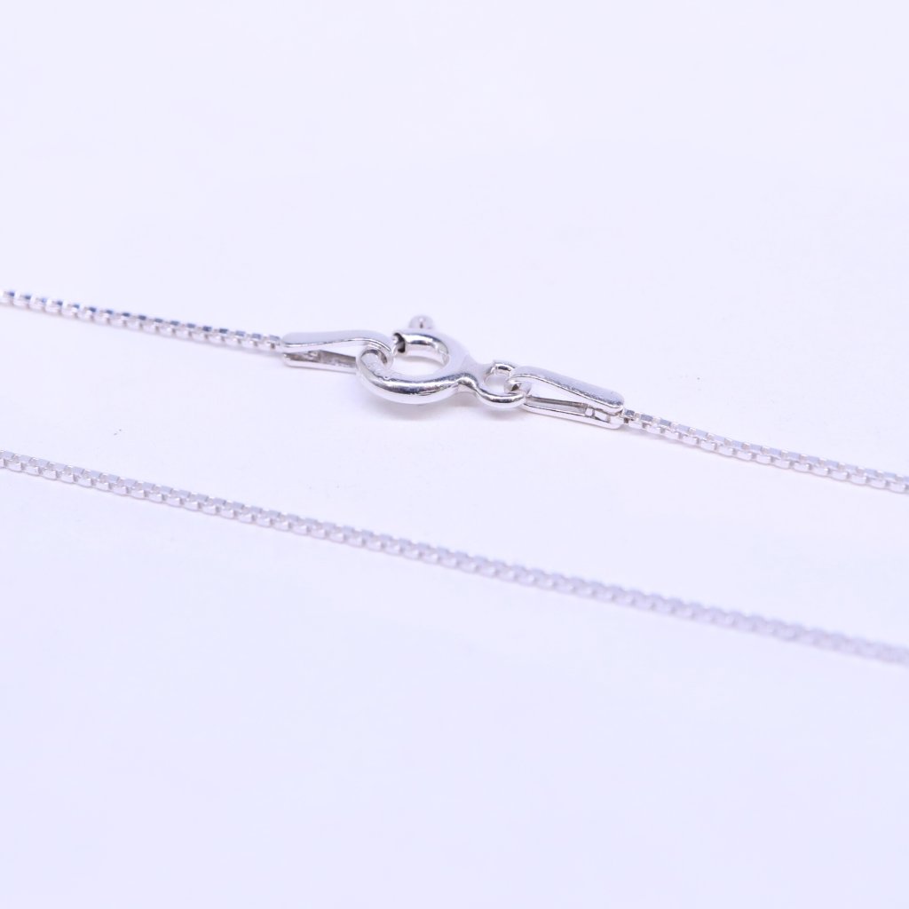 Stříbrný jemně hranatý řetízek má zapínání na karabinku. Hodí se k menším a středně velkým přívěskům.